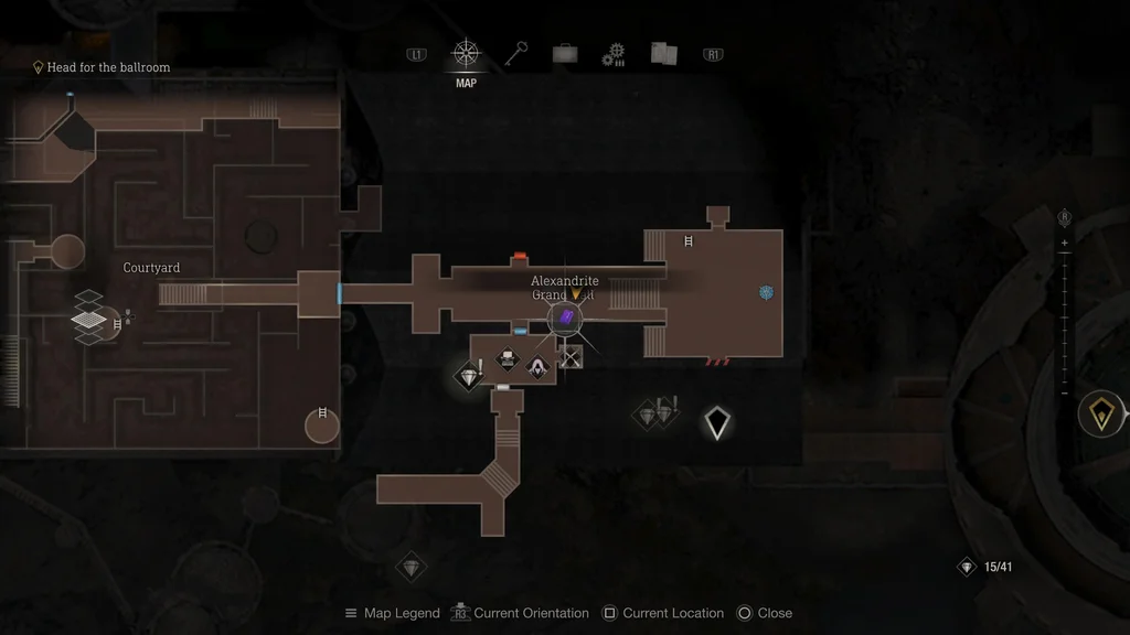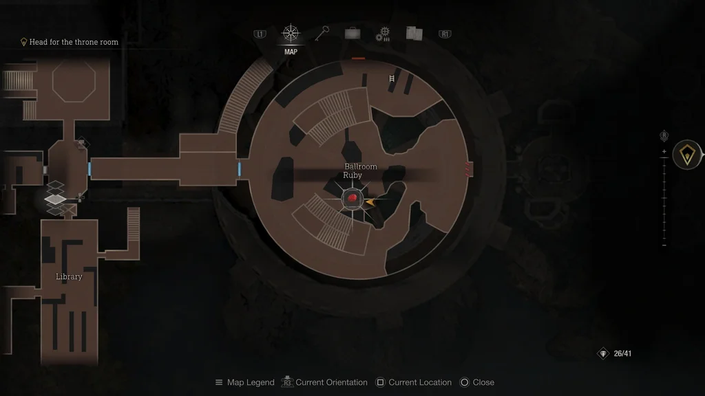 Цей скарб висить під люстрою та уламками в центрі Бальної зали. Застреліть або зріжте срібний ліхтар, щоб зібрати цей рубін.