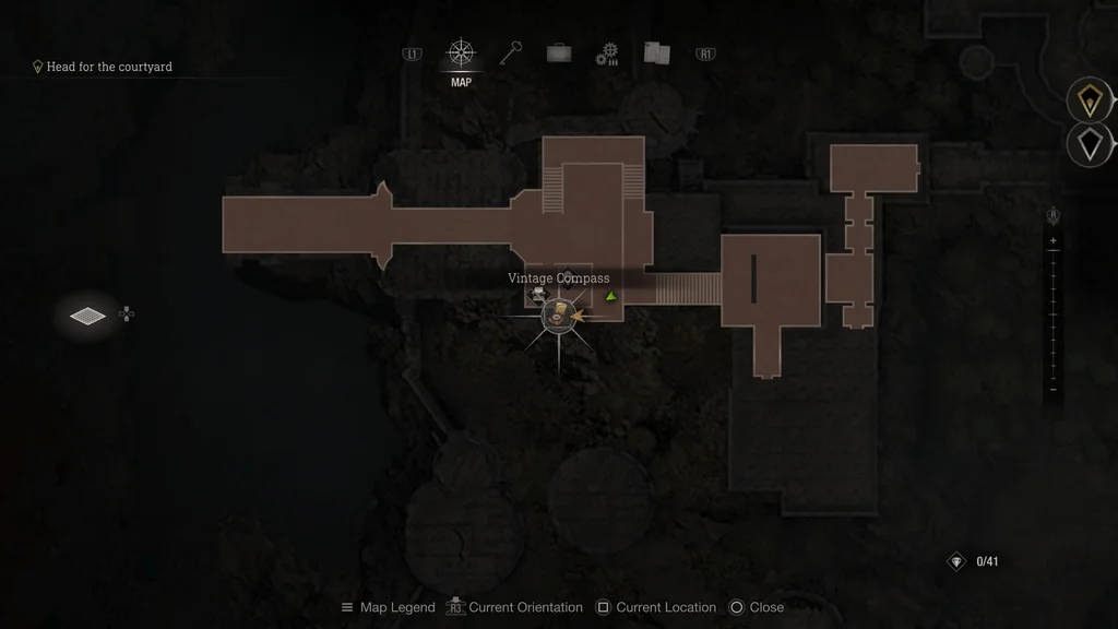 Перетнувши підйомний міст, щоб увійти до замку в кінці глави 6 - Контрольний пункт, обійдіть стайні, де Торговець влаштував магазин. Розбийте бочки, що загороджують шлях, і йдіть через алею за стайнями, щоб отримати старовинний компас.