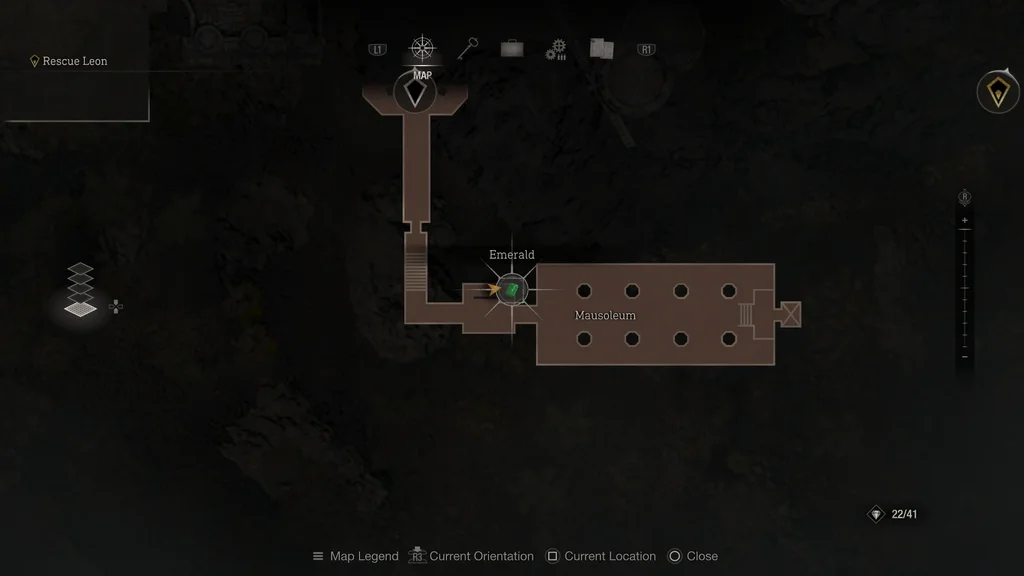 Цей скарб знаходиться в безпечній зоні на захід від Мавзолею. Після того, як ви подзвоните в гонги, щоб відкрити двері, і ледве втечете від броньованих ворогів, ви опинитеся в кімнаті, до якої вороги не зможуть отримати доступ. Оберніть перегородки в цій області та використовуйте зв’язку ключів №1, щоб відкрити скриню, у якій знаходиться цей Смарагд.