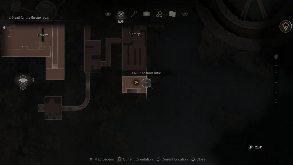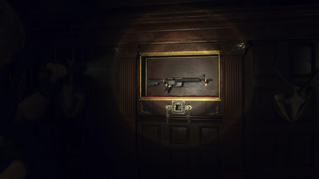 Хоча цей скарб неможливо розблокувати, доки Леона не буде звільнено на початку глави 10 «Бальний зал», ви повинні щось зробити під час гри за Ешлі, інакше штурмова гвинтівка CQBR буде недоступна. Досліджуючи бібліотеку за Ешлі в розділі 9, обшукайте південний кінець області, і ви знайдете п’єдестал, де можна поставити свій ліхтар. Помістіть свій ліхтар на п’єдестал, і книжкова полиця переміститься, щоб надати вам доступ до таємного шляху.