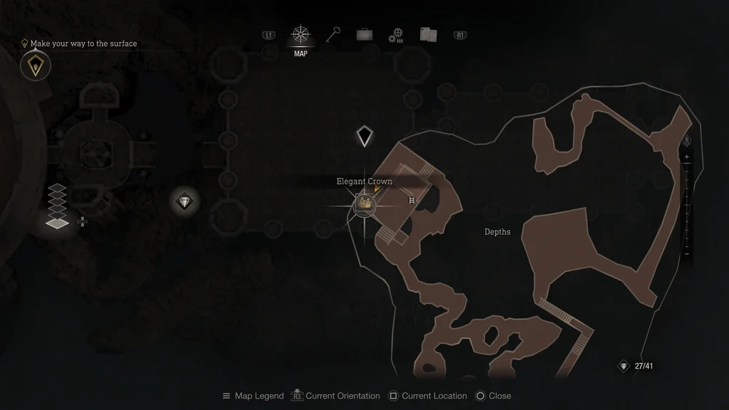 Дуже прибуткову елегантну корону можна зібрати безпосередньо перед підйомом по драбині в глибинах. Дотримуючись стежки до маркера цілі, ви незабаром підніметеся сходами, які виведуть вас із води. Піднявшись маленькими сходами, пройдіть до кінця коридору, і ви знайдете Елегантну корону на землі біля ліхтаря та трупа.