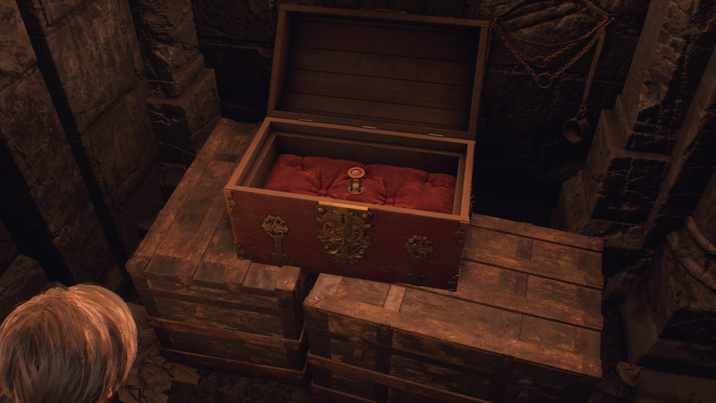 Проведіть Ешлі через щілину в стіні, зображеній вище, і вона відімкне вам двері. Усередині ви знайдете вишукану скриню, в якій знаходиться Розбещений ідол.