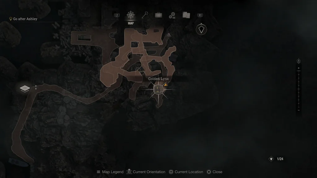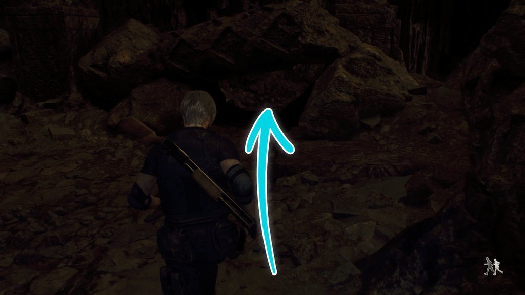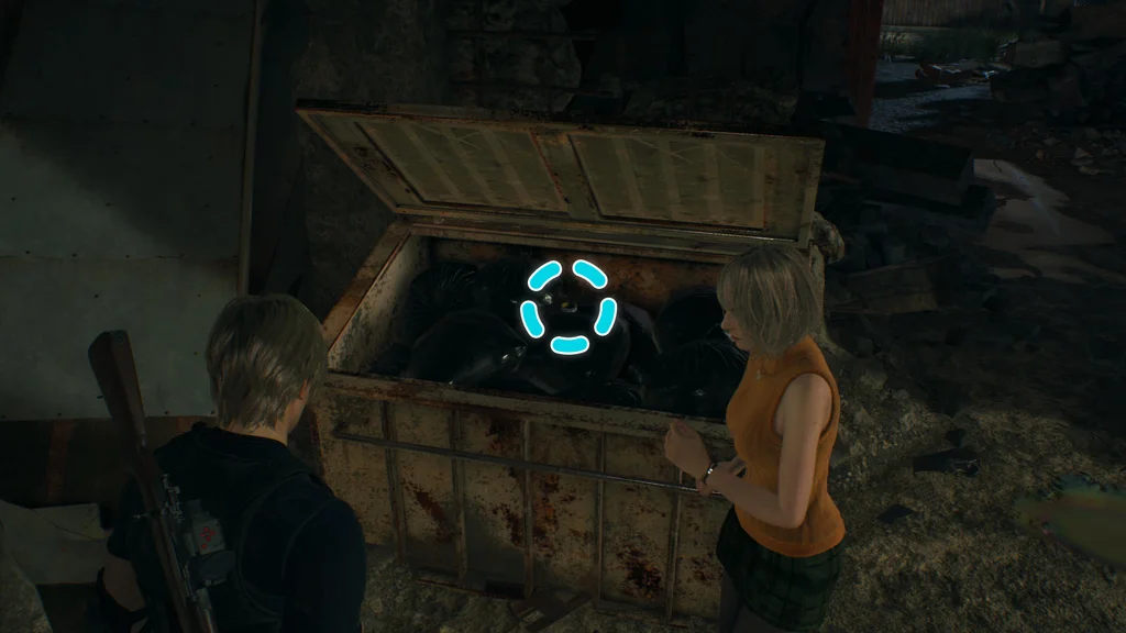 УВАГА! Просуваючись цією територією, ви незабаром побачите кат-сцену, де Леон бачить Ешлі. Одразу після цього вам потрібно буде опуститися на нижній рівень, щоб продовжити рух до мети. Перш ніж зістрибнути, переконайтеся, що ви повністю дослідили всі попередні області, тому що ви не зможете повернутися назад після скидання.