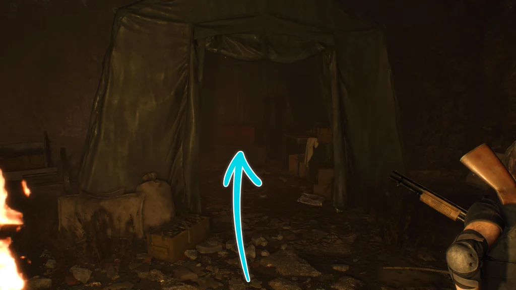 Після кат-сцени, яка розкриває першого ворога з RPG, вирушайте в халупу праворуч. Опинившись у халупі, прямуйте вниз тунелем, потім поверніть праворуч, щоб знайти ворота та бочку з вибухівкою, зображену нижче.