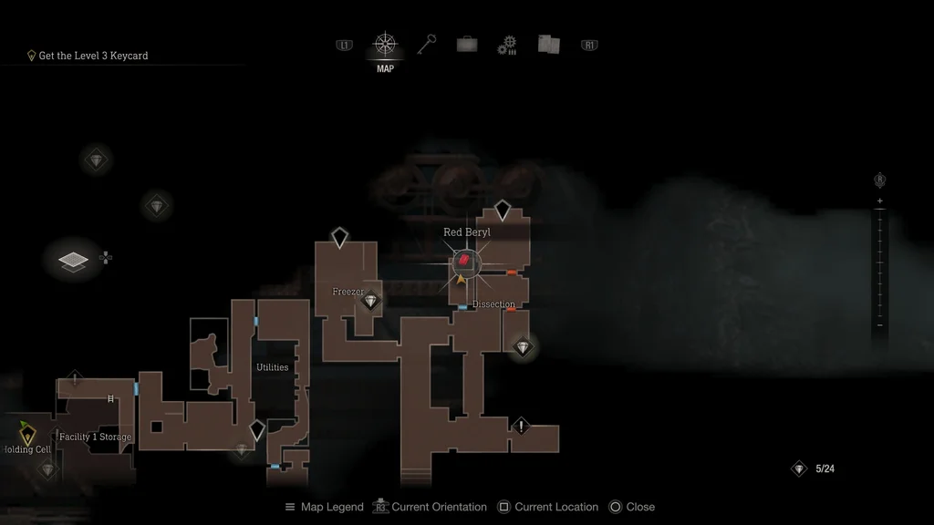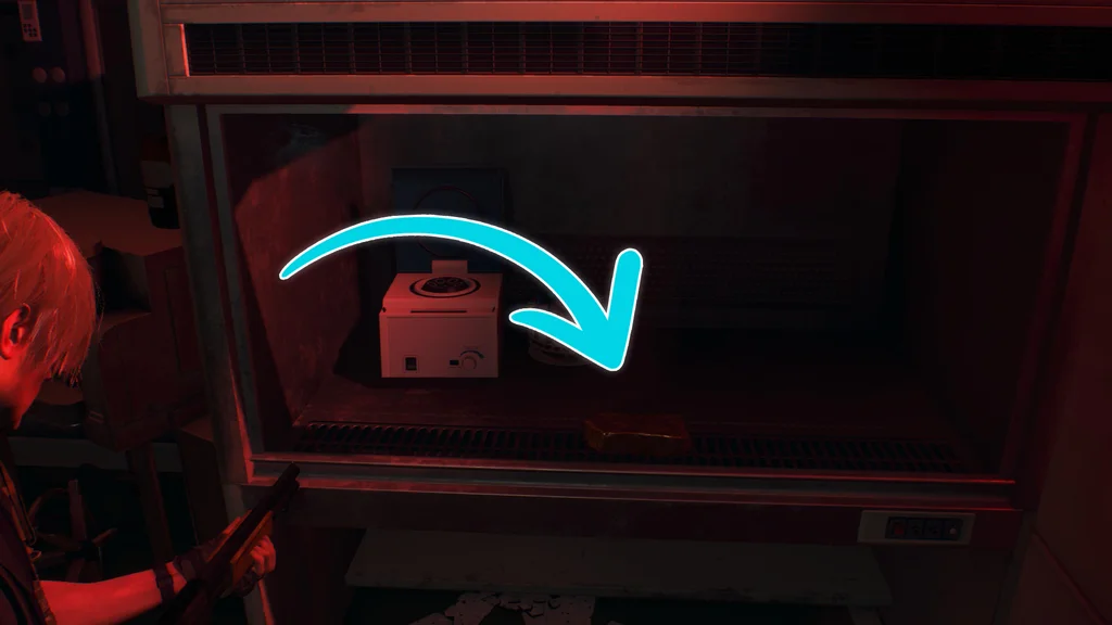 Поки живлення в морозильній камері ввімкнено, вирушайте у верхню ліву кімнату в зоні розтину. У кінці цієї вузької кімнати ви знайдете кілька аптечних шаф. Розбийте центральну скляну шафу, і тепер ви зможете зібрати цей дорогоцінний камінь Червоний Берил. У цій кімнаті ви також можете знайти спрей першої допомоги та порох.