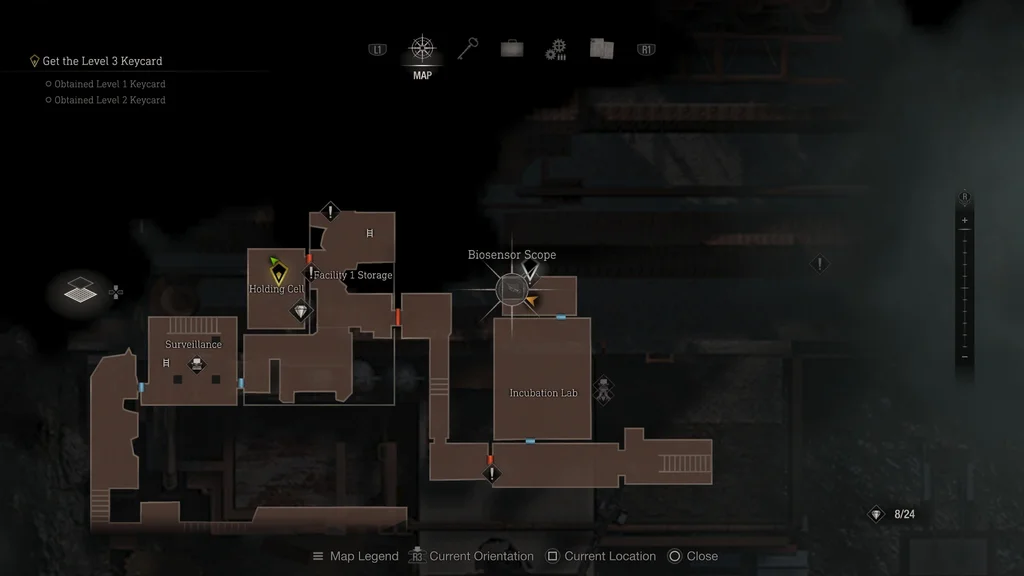Пройдіть крізь інкубаційну лабораторію та обшукайте кімнату на північ, щоб знайти відкритий портфель із біосенсорним прицілом.