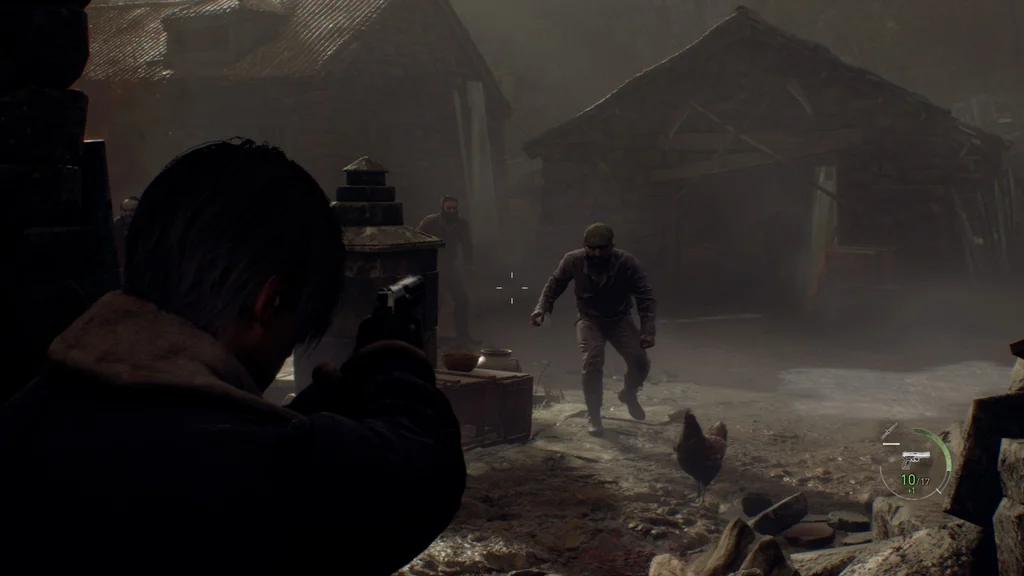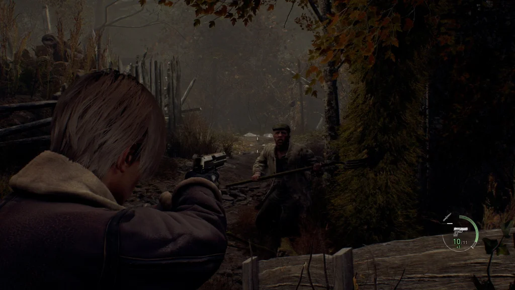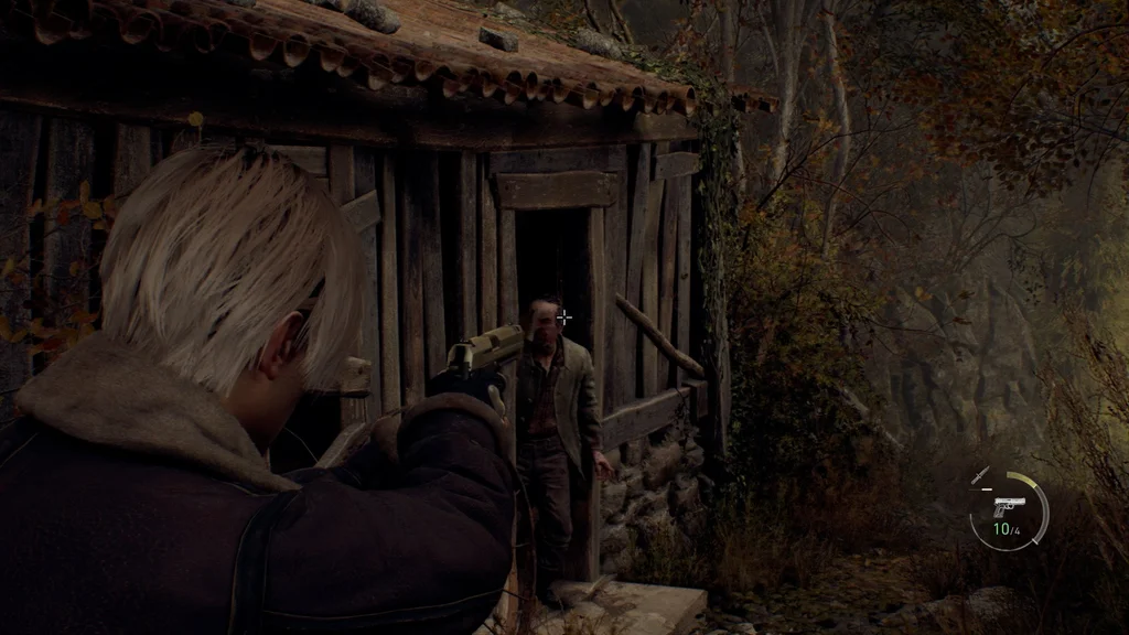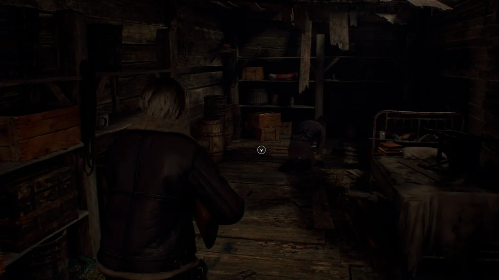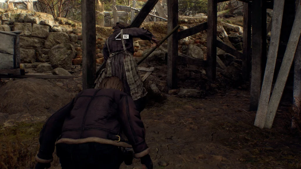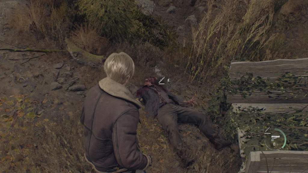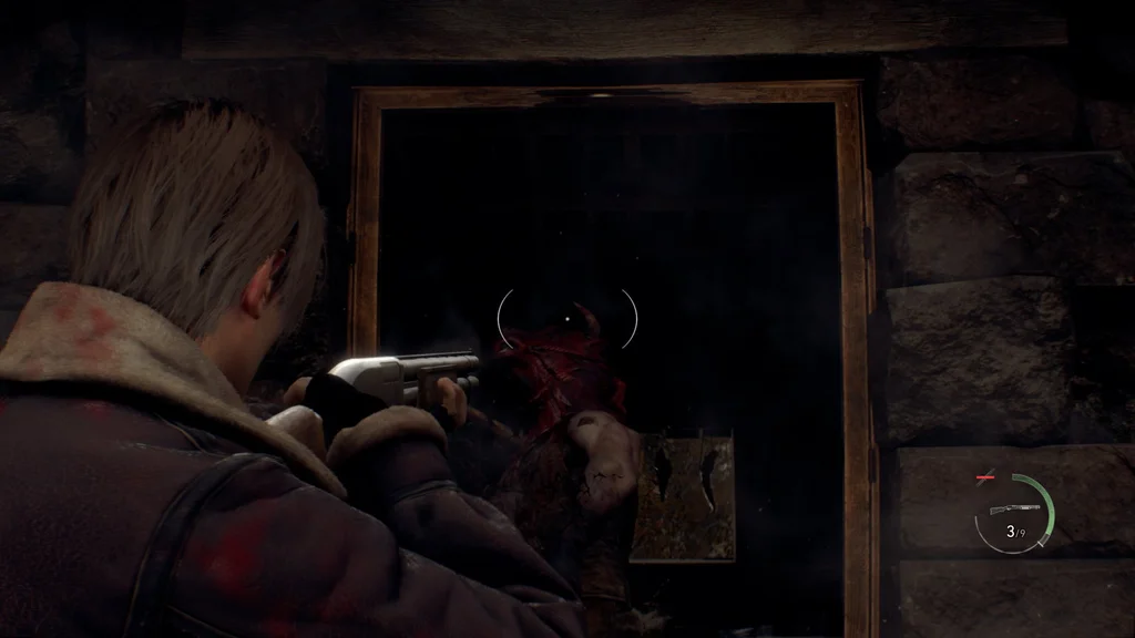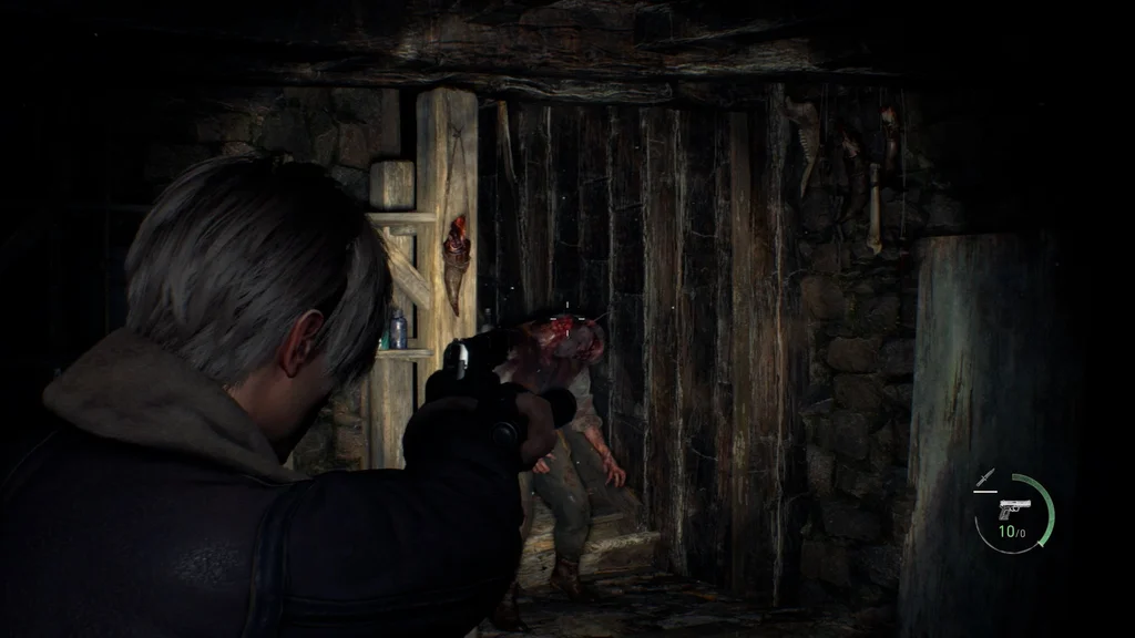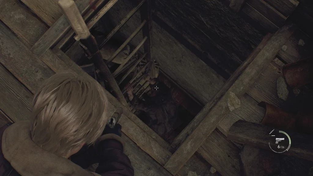 Коли ви повернетеся, щоб вийти з підвалу, житель села (Ганадо), якого ви вбили раніше, спуститься сходами, хитаючись, — із зігнутою шиєю і все таке. Він кинеться на вас із дивовижною швидкістю, тож продовжуйте відступати, стріляючи йому в голову чи груди, якщо зможете. Якщо вам вдасться швидко втекти від його випаду, ви також можете швидко вдарити його ножем, натиснувши R2, або ударом, утримуючи спочатку L1.