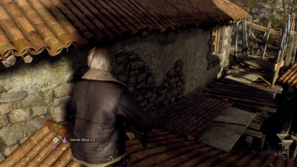 Поверніться на дерев’яні платформи на другому поверсі великого будинку та перейдіть на низький дах над дверима. Тут можете знайти блакитний оксамитовий камінь, схований на даху, який вважається одним із скарбів села, і пізніше його можна буде продати за гроші.