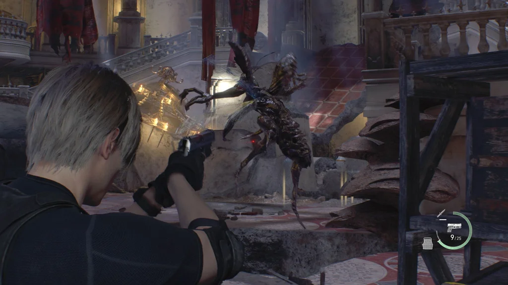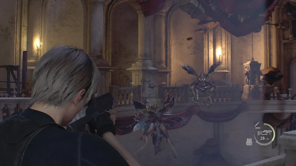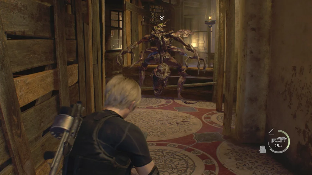 Обережно підійдіть до головного входу в бальний зал і відчиніть двері назад до Великої зали, а потім розверніться та вліво вздовж північної стіни. Ви пройдете під сходами крізь дерев’яні балки та риштування, а ще двоє новистадорів спробують проскочити. З цієї відстані вистріліть один-два рази в їхні сяючі очі, щоб вони підскочили на задні лапи, приголомшені. Це дає вам шанс підбігти та швидко вдарити їх прямо в грудну клітку, а також завдати кількох ударів ножем, коли вони перекинуться назад, щоб змусити їх вибухнути.