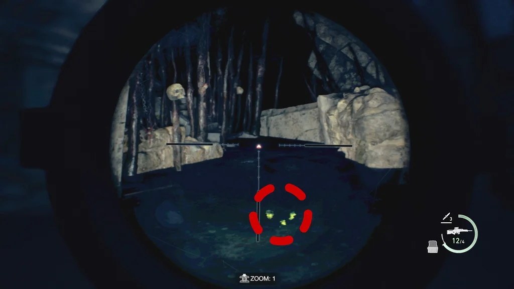 Після того, як ви хлюпаєте вниз, рухайтесь праворуч і тримайте зброю напоготові, коли ви відштовхуєтеся вбік до вигину, що вигинається ліворуч. Хороший спосіб дізнатися, що прийде наступний замаскований Новістадор, якщо ваш HUD у нижньому правому куті з’явиться без натискання кнопки прицілювання. Як тільки це станеться, підготуйте свою гвинтівку та усуньте наступну загрозу.