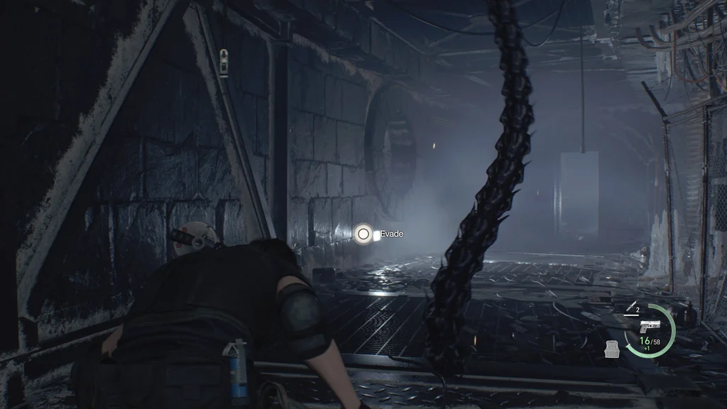 Коли ви проходите повз інший менший зал ліворуч із третім азотним душем, будьте готові до того, що ваш переслідувач почне намагатися атакувати вас своїм хвостом. У той момент, коли ви побачите хвіст, який з’являється зверху або знизу, натисніть присісти, щоб ухилитися, коли з’явиться кнопка дії, і уникнути засідки.