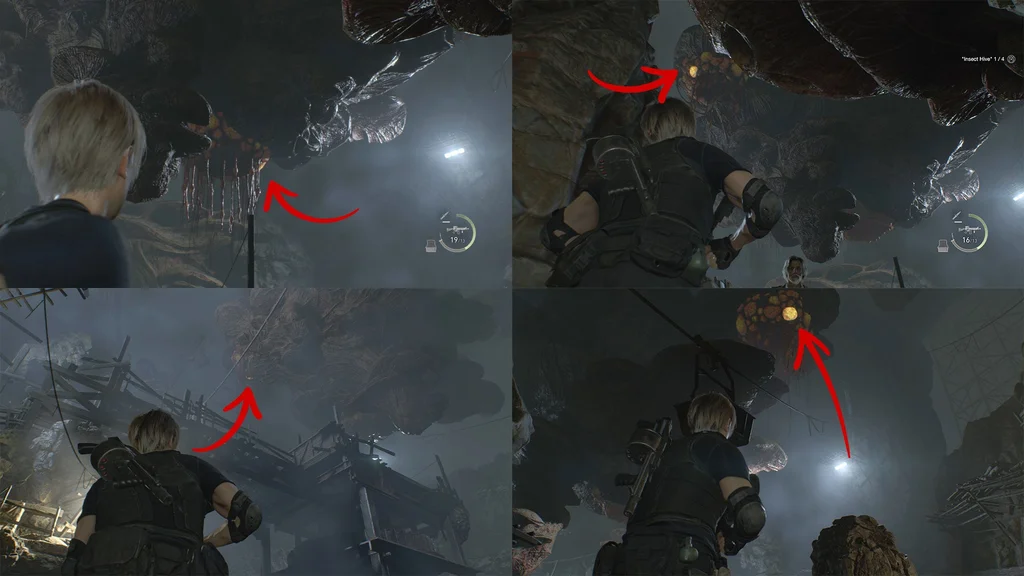 Вийдіть із укриття так, як ви увійшли, вздовж правої стіни та подивіться прямо вгору на сяючу жовту пляму вздовж вулика вгорі та вистріліть у неї кілька разів із пістолета, щоб підірвати її та закрити діру.