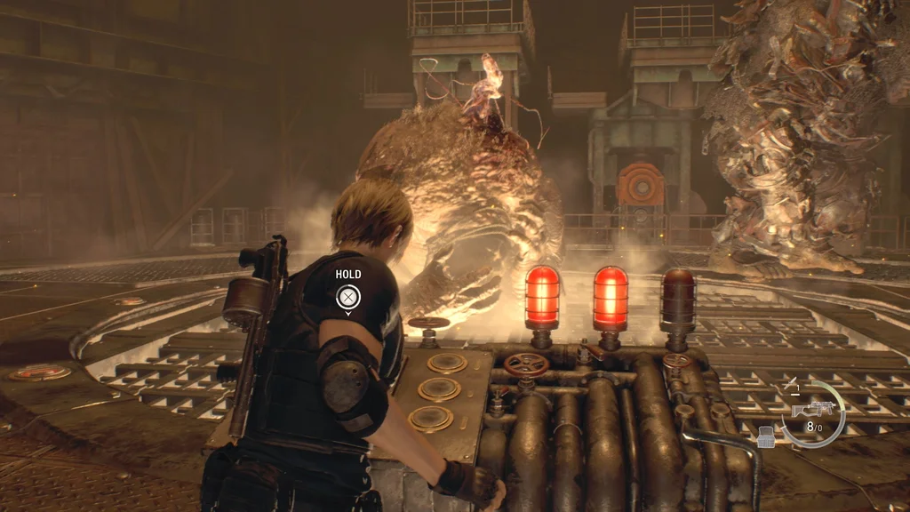 Зауважте, що якщо ви грали в класичну гру Resident Evil 4, ви можете пам’ятати гігантський чан з лавою в центрі кімнати, а поруч є панель керування, яку можна взяти, щоб відкрити її, як люк. Однак у Remake Gigante не такі вже й дурні. Коли ви спробуєте відкрити його, вони відступлять від центру, навіть якщо вони зайняті боротьбою з Луїсом. Вам потрібно буде відволікти їх іншим способом, щоб це спрацювало.