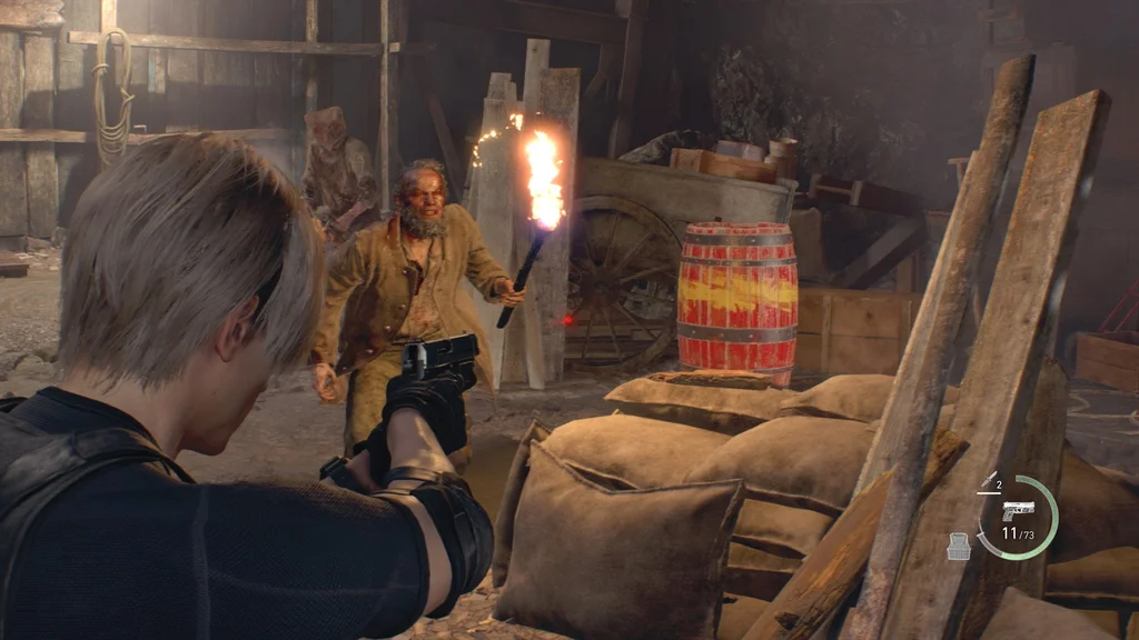 Подивіться біля низу сходів перед собою, щоб помітити вибухову бочку, і зачекайте, поки житель села з бензопилою розбігається, перш ніж підірвати її йому в обличчя, але стежте, щоб вас не підстерегли інші Ганадо, які біжать іншими сходами до зліва.