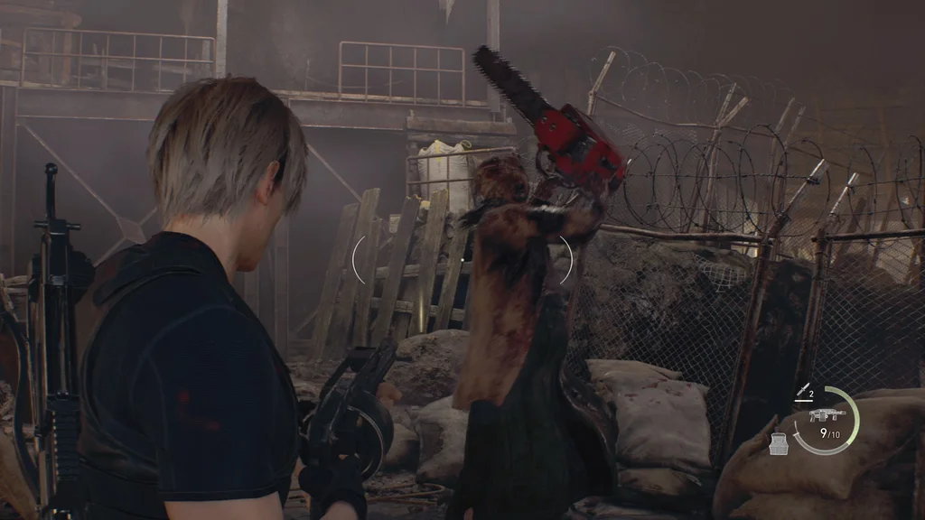 Згодом ви побачите, що житель села з бензопилою цього разу знову з’явиться праворуч, і ви тривалий час перебуватимете поруч із ним. Продовжуйте розстрілювати його, щоб він не похитнувся, поки він знову не піде вправо.