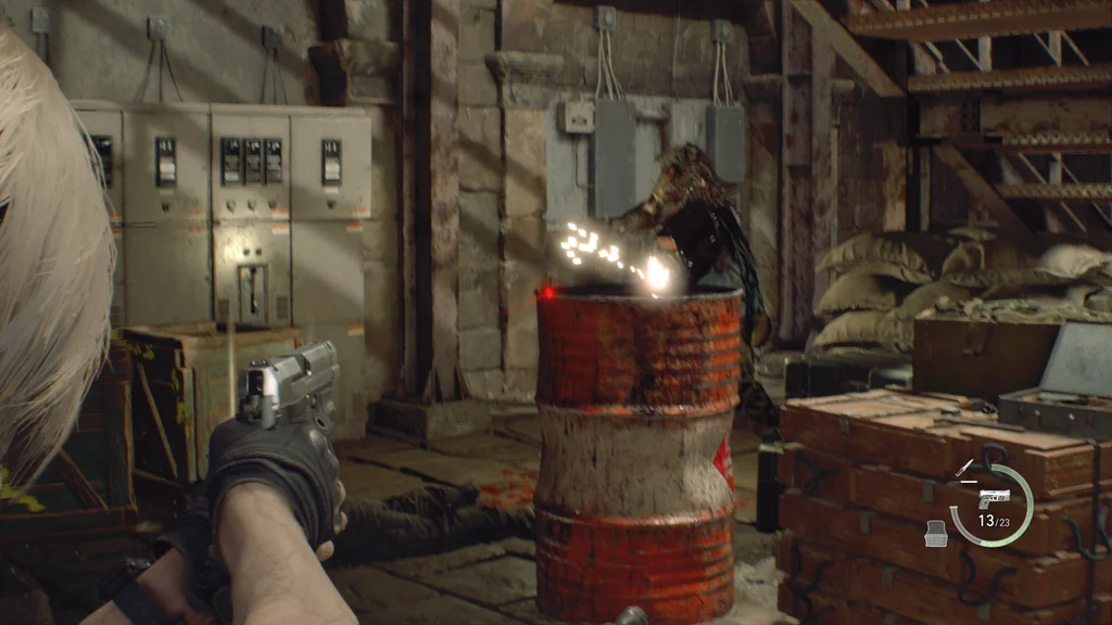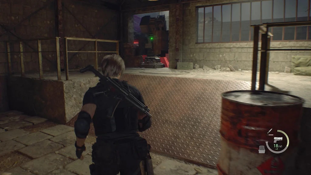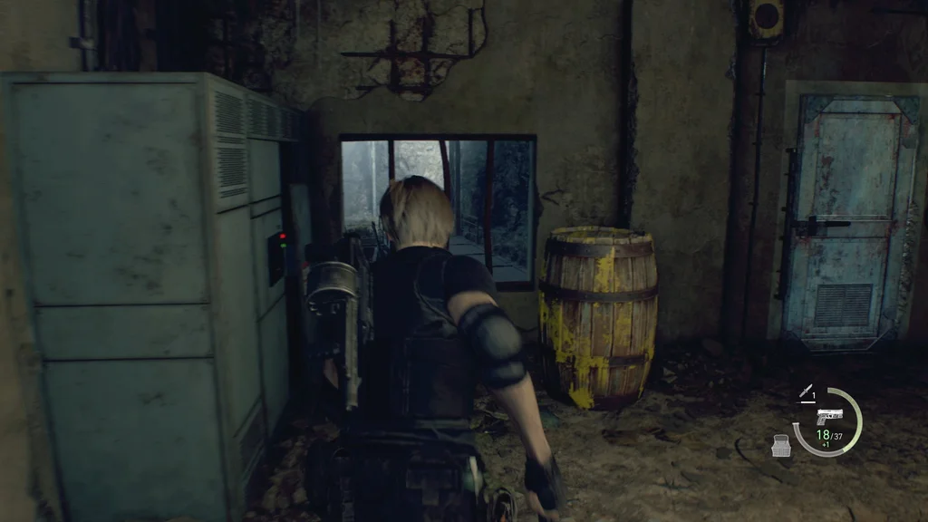 Замість того, щоб йти центральним підходом через міни та пастки, підніміться сходами ліворуч і будьте готові до нових новистадорів, коли досягнете кімнати з вибуховою бочкою. У кімнаті також є жовта трава та чорний окунь, а також патрони до пістолета в синій шафі для документів, тож не забудьте схопити їх і розбити стволи, але зверніть увагу на солдата з ракетницею, який носить далі.