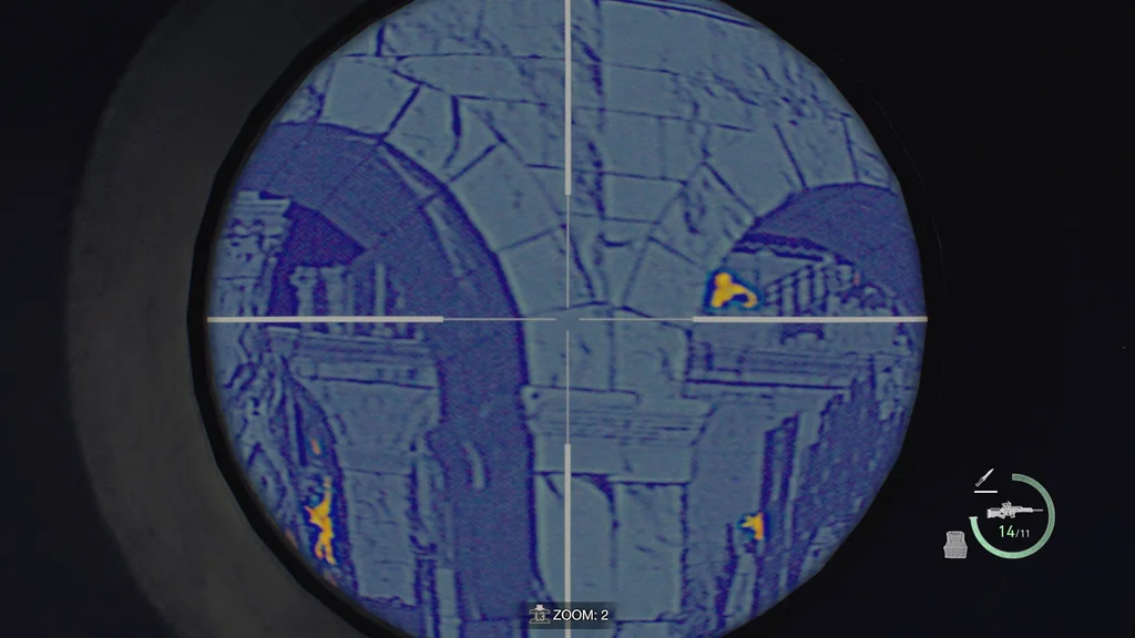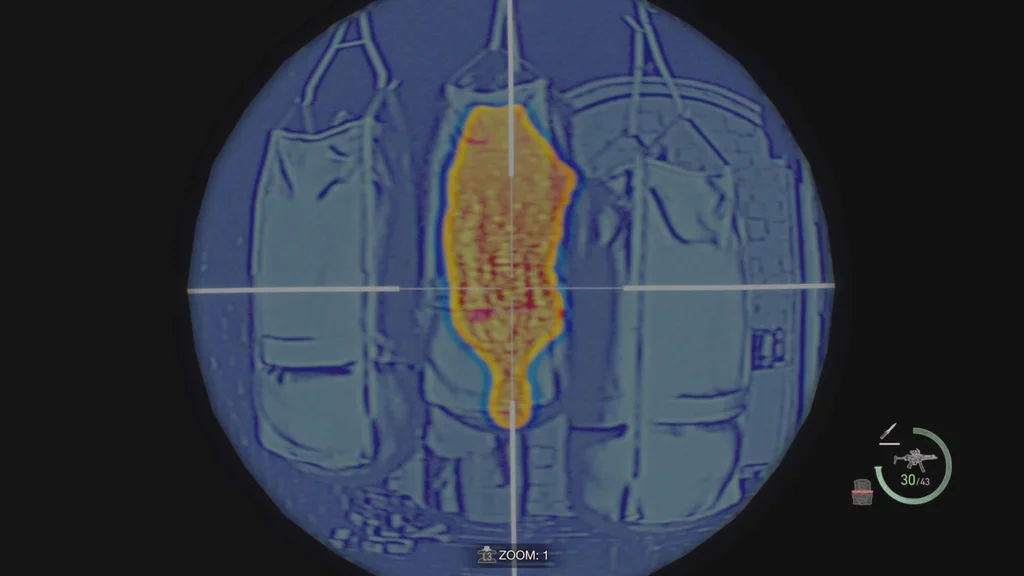 Стара будівля, схожа на церкву, здається, була перетворена на сховище — таке, що наповнене висячими мішками для трупів. Це здається гарною ідеєю переоснастити ваш біосенсорний приціл на гвинтівку.