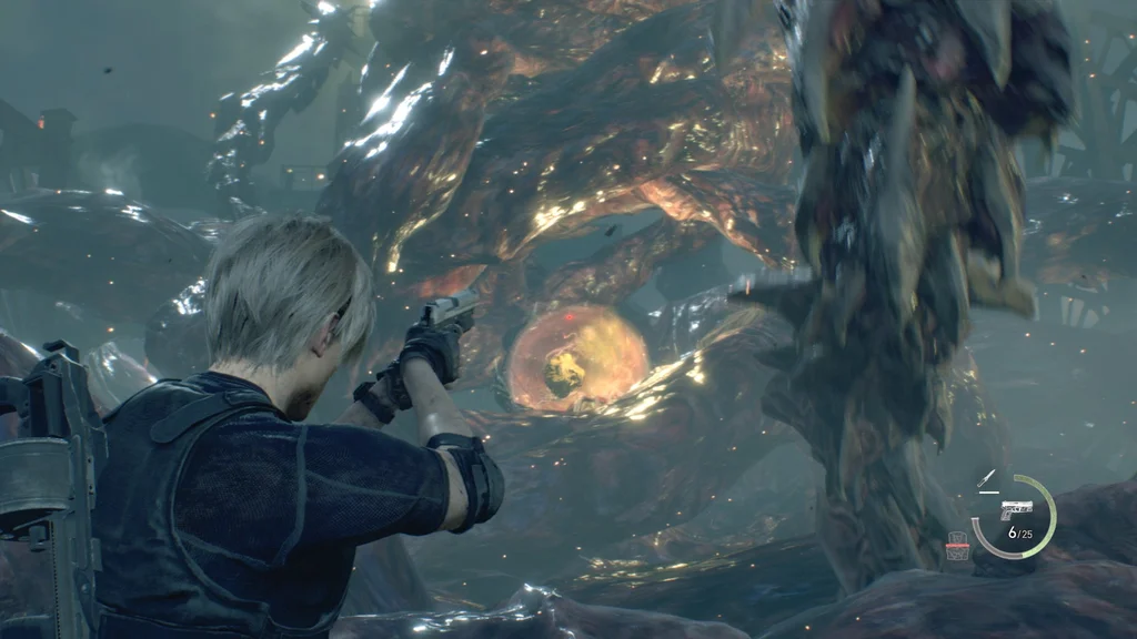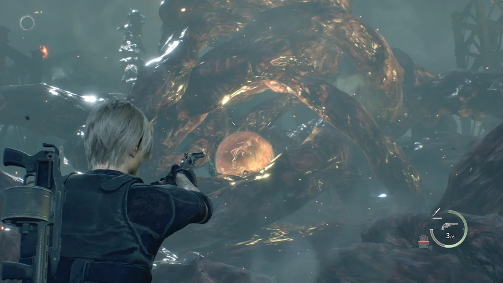 У цій наступній фазі Леон опиниться в пастці серед своєї форми, що звивається, з обмеженим простором для руху, але Седдлер і його слабке місце стоять прямо перед вами. Настав час використати все, що у вас залишилося на його єдиному слабкому місці, включно з патронами Magnum.