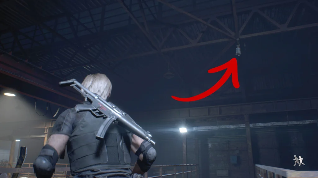 Повертаючись на склад, ви не зможете повернутися тим шляхом, яким прийшли, тому замість цього шукайте складану драбину з лівого боку, до якої можна підняти Ешлі, що дозволить вам пройти вздовж верхнього поверху.