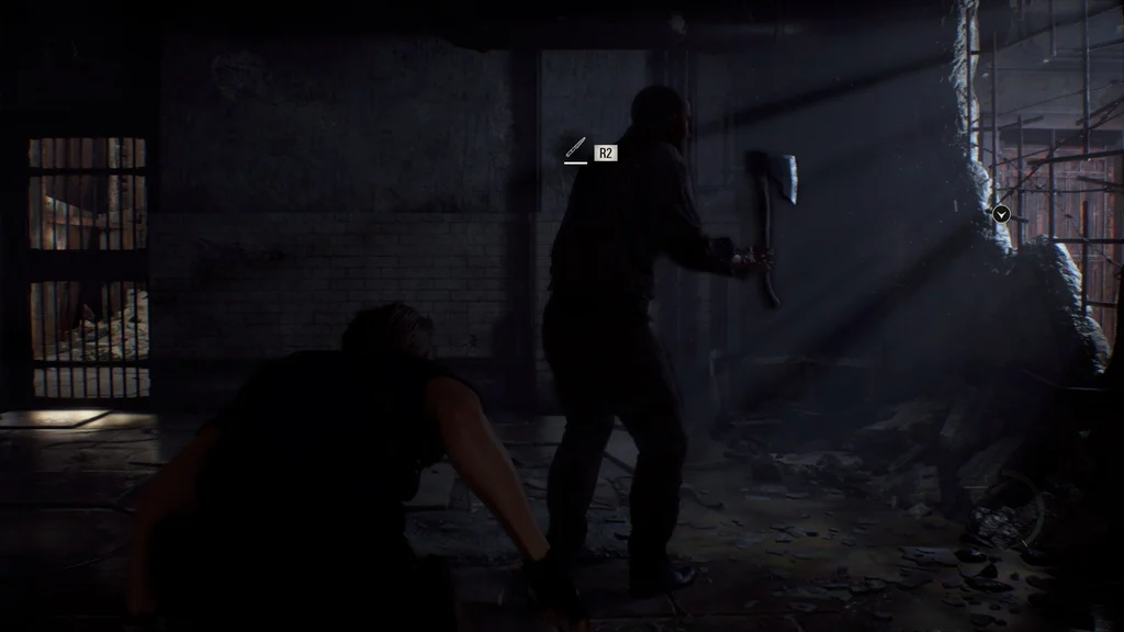 У наступній кімнаті ви повинні помітити жителя села, який слідує коридором із розбитою стіною. Якщо ви рухаєтеся швидко, ви можете перестрибнути через низьку стіну, присівши навпочіпки, щоб підкрастися й вивести його, або ви можете спробувати зачепити його в лоб і парирувати його атаку вилами – це ваш вибір.