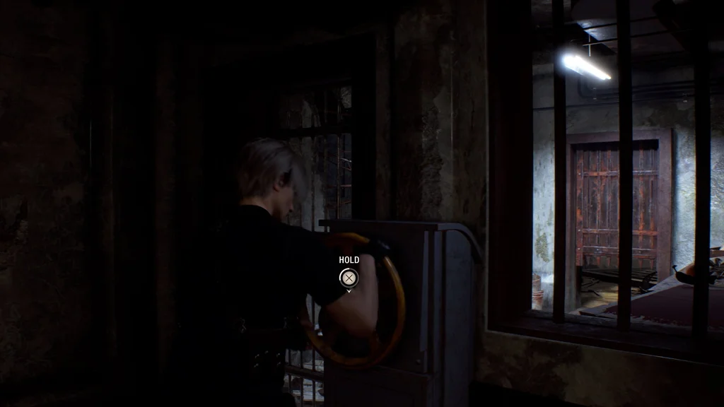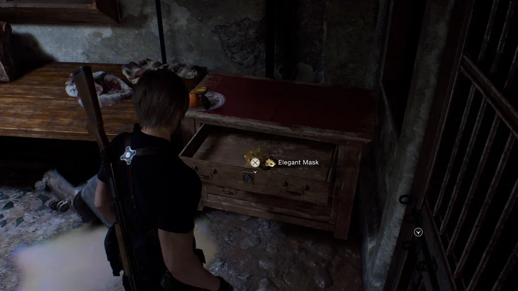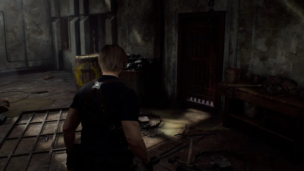 Тут ви зможете підібрати все відсутнє спорядження (Леон замінить ножі та спорядження, які ви зібрали, якщо ваш інвентар буде заповнений, тож вам доведеться забрати їх знову). Щоб вийти, відімкніть двері колесом і зверніть увагу на замкнену шухляду, перш ніж вийти.