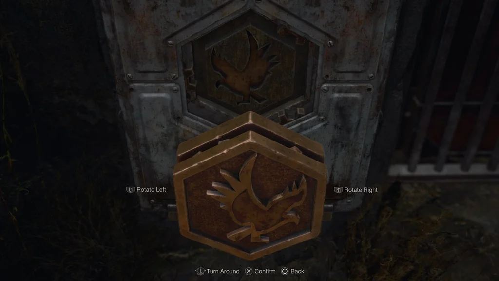З шестикутною емблемою в руці взаємодійте з великими воротами та обертайте символ птаха за допомогою R1/L1, доки дзьоб не повернеться праворуч, а потім використовуйте ручку керування, щоб повернути весь знак та помістити його в слот.