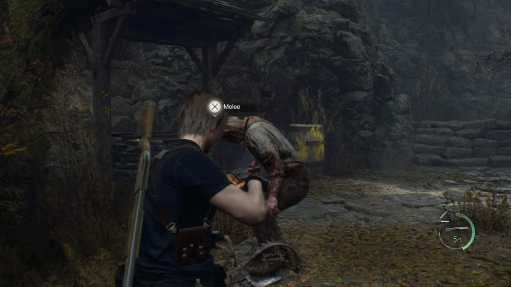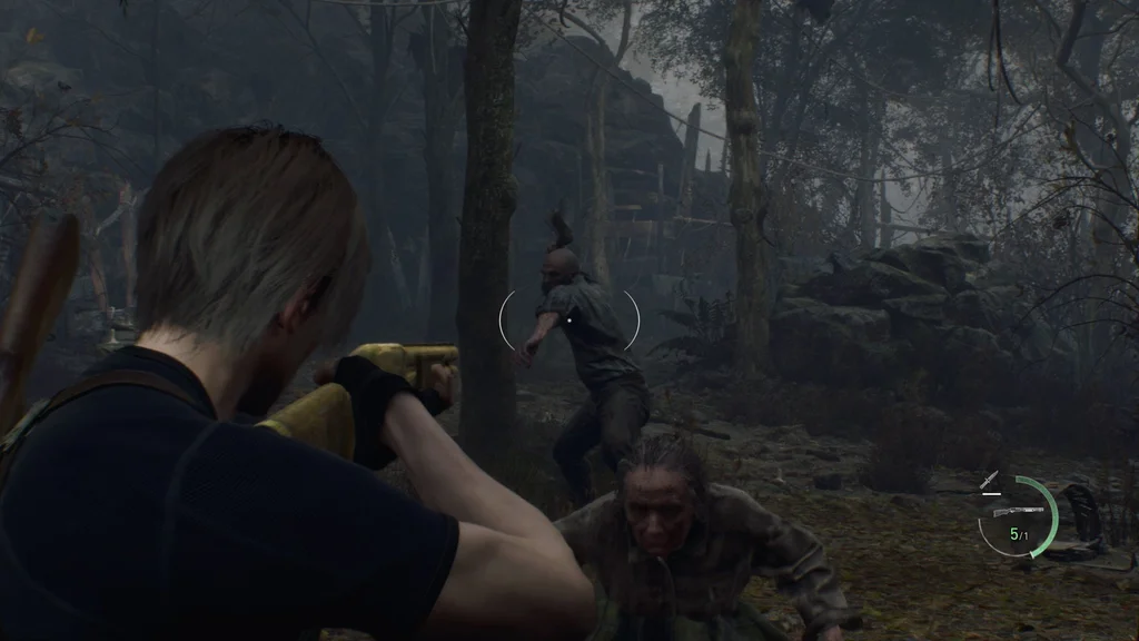 Якщо ви хочете випередити їх, обережно пройдіть лівою стежкою, щоб стати позаду потенційного засідника (і трохи патронів для пістолета) і змусьте його замовкнути, перш ніж повернутись, щоб дістати іншого жителя села — просто стежте за різноманітними ведмежими пастками. Ви може завести третього жителя села, який спускається дальніми сходами, в одну з пасток і вбити його ногою.