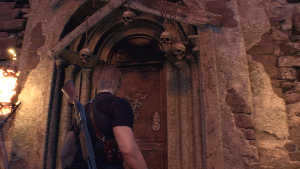 Крім ящика в одному кутку та дуже зловісного звуку дихання, що доноситься з-за великих зачинених дверей, тут нічого іншого, тому продовжуйте йти через відкриті ворота (і не забудьте про блакитний медальйон високо за воротами).