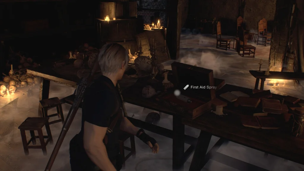 Окрім неймовірно величезного та тривожного черепа, обов’язково перевірте обидві сторони столу на наявність файлу – Illuminados 4:9, футляра зі спреєм першої допомоги та шухляди біля дверей, що ведуть назовні.