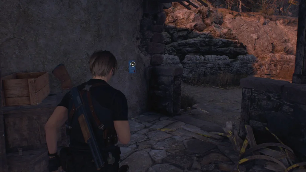 Очікуйте, що більше жителів села прийдуть тим самим шляхом, яким ви прийшли, тож переконайтеся, що ви закрили всі свої тили, щоб вас не схопили чи не напали ззаду, доки все не заспокоїться. Не забудьте пограбувати всі бочки на цій другій доріжці, перш ніж продовжити, і подивіться праворуч від південного пандусу, щоб побачити ще один синій медальйон у щілині між дерев’яними дошками біля стіни.