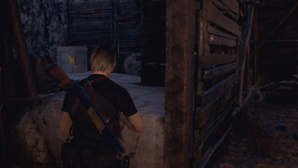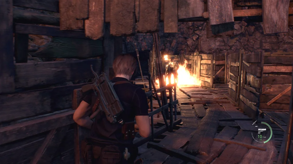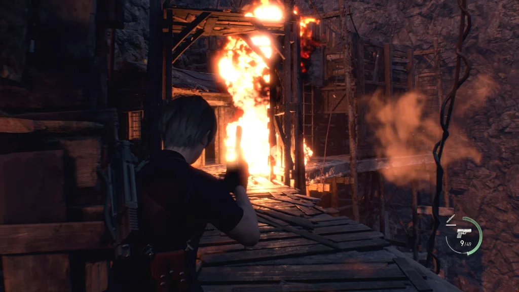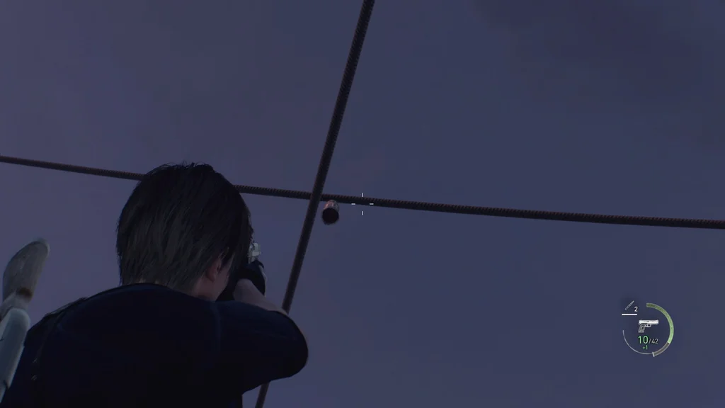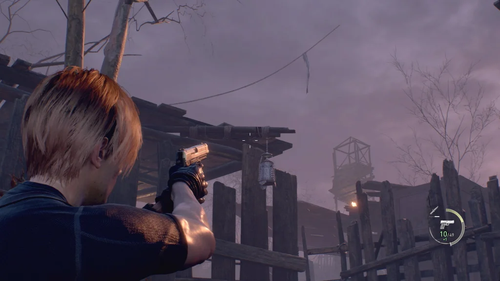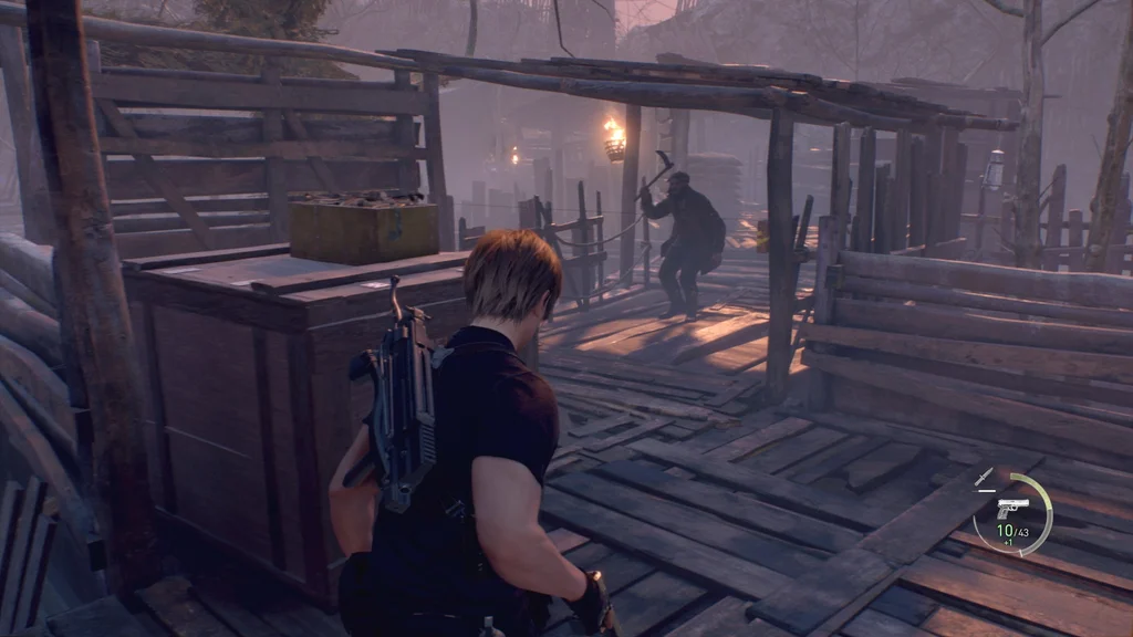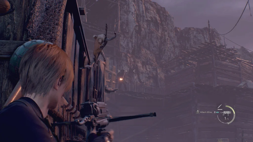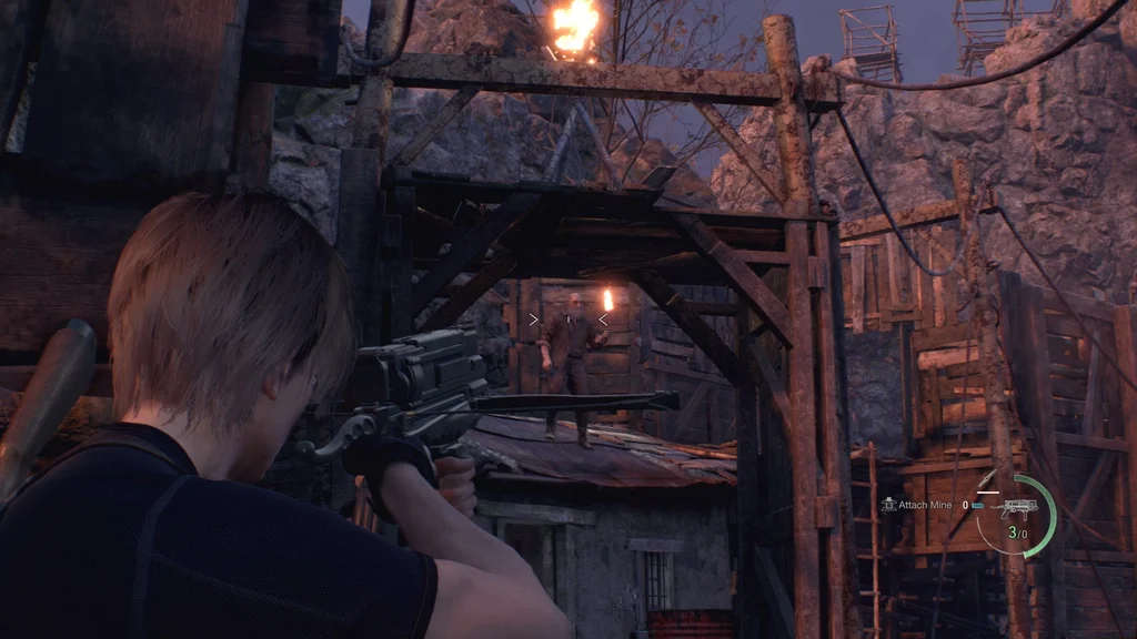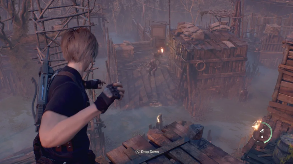 Коли ви виходите, ви можете почати підніматися по драбині, щоб знайти дорогу назад через високу платформу, але будьте готові до того, що один житель села підбіжить ззаду, і інші з’являться, обходячи нижню частину справа наліво, коли ви встанете на високу платформу. Ви вирішуєте, чи хочете ви використовувати цей вибуховий ствол як приманку, чи стріляти снайпером, поки вони внизу.