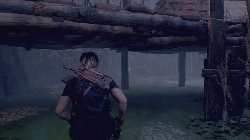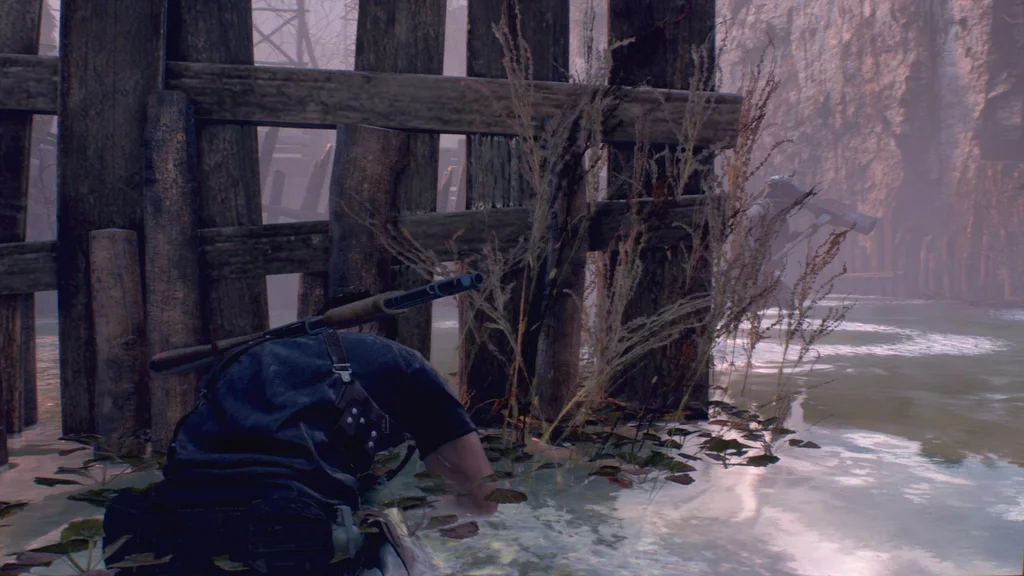 Ліворуч є невеликий пандус, який піднімається до бочки, що може зламатись, але головне місце, про яке варто турбуватися, — це назад на північ, де ще одна ділянка дерев’яних доріжок. Ви можете спробувати прокрастися на мілководді праворуч, але є вороги, які патрулюють як у воді, так і на платформі.