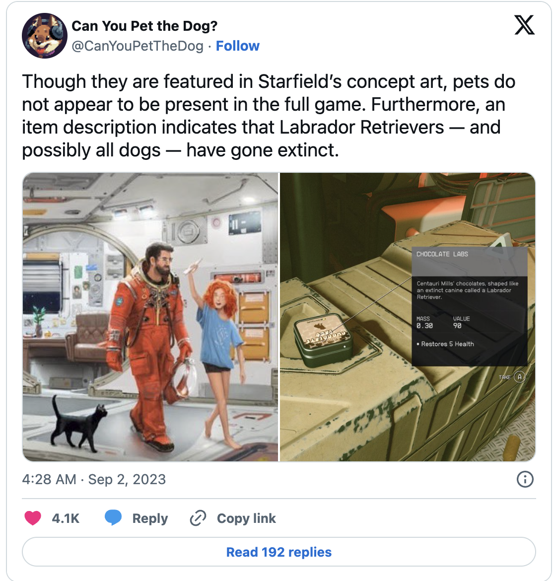 Акаунт Twitter/X Can You Pet the Dog оприлюднив жахливу новину, підтвердивши, що принаймні лабрадорів-ретриверів більше не існує у всесвіті Starfield. «Хоча вони представлені в концепт-арті Starfield, домашні тварини, здається, відсутні у повній грі», — опубліковано в обліковому записі. «Крім того, опис предмета вказує на те, що лабрадори-ретривери — і, можливо, всі собаки — вимерли».
