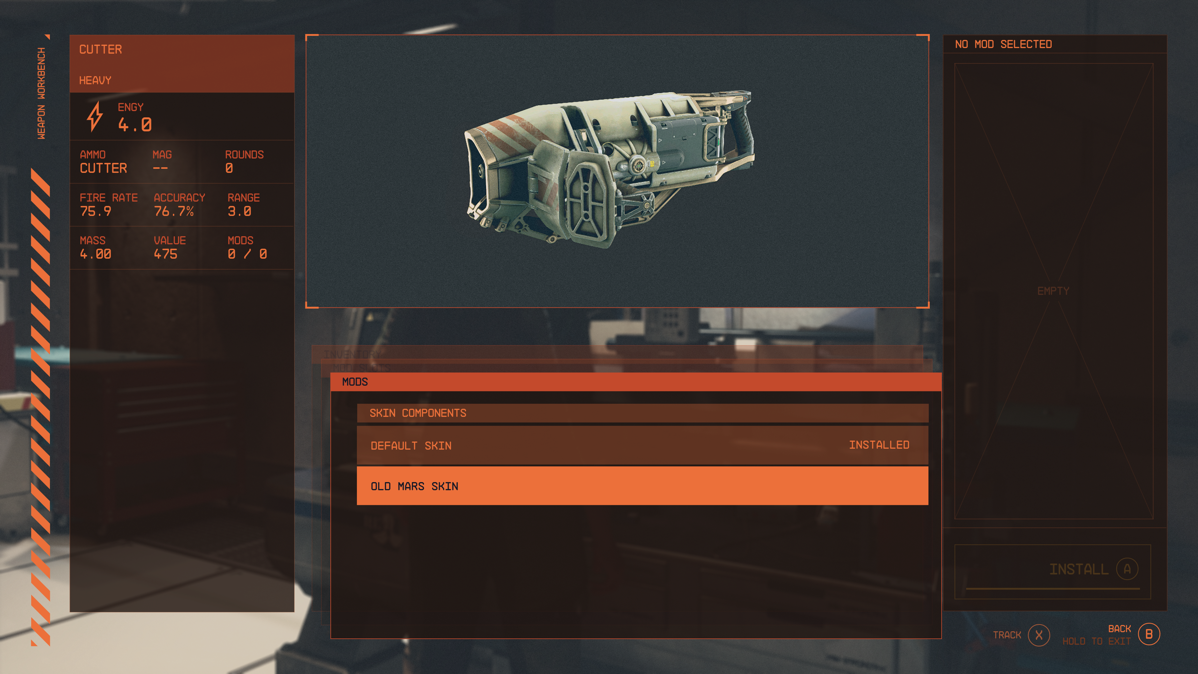 У верстаку для зброї у вас буде скін Старого Марса для вашого інструменту для видобутку корисних копалин лазерного різака. Тим часом ви знайдете набір скінів Deep Mining для вашого стартового пакету посилення та шолома. Невдовзі ви можете відмовитися від цього скафандра (у грі їх десятки, кожен зі своїми властивостями), але пізніше ви також зможете знайти кращі версії шахтарського скафандра, якщо захочете й надалі використовувати цей косметичний скін.