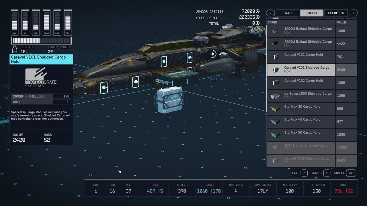 Коли ви станете членом Багряного флоту, вам доведеться відвідати Ключ, космічну станцію в системі Крайкс. Незабаром після цього вас познайомлять з Жасмін, торговцем кораблями. Перевірте її товари та знайдіть модулі, у назві яких є «Shielded Cargo Hold». Переконайтеся, що ви прикріпили їх до свого корабля, щоб отримати ефект.